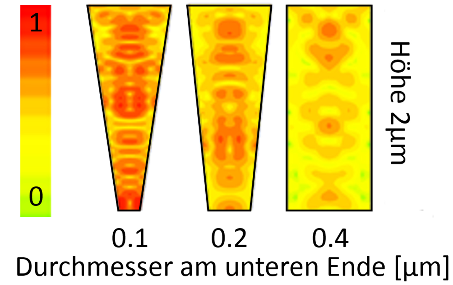 | Aufnahmen mit dem Raster-Elektronenmikroskop zeigen, wie regelmäßig die in ein Silizium-Substrat eingeätzten Trichter angeordnet sind (links: Längenskala 5 Mikrometer, rechts: 1 Mikrometer). Die Trichter messen oben im Durchmesser noch rund 800 Nanometer und laufen unten auf etwa hundert Nanometer spitz zu. Bild: S. Schmitt/MPL Die Simulation zeigt, wie sich die Form der Nanostrukturen auf die Lichtkonzentration auswirkt. Je spitzer der Trichter zuläuft, desto stärker ist auch das Licht konzentriert (rot: hohe Konzentration, gelb: geringe Intensität). Bild: G. Shalev, S. Schmitt/MPL